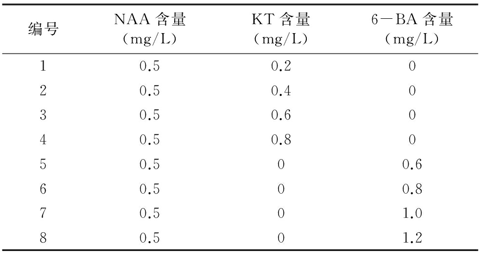1.2.2 诱导分化培养基的选择 在超净工作台上,将无菌苗置于无菌培养皿中,将无菌苗的叶柄切成1 cm左右的小段,随后将叶柄接种于含有不同浓度生长调节剂的分化培养基(表1)中进行分化诱导培养,以筛选出诱导叶柄分化成不定芽的适培养基。每种培养基接种叶柄120个。