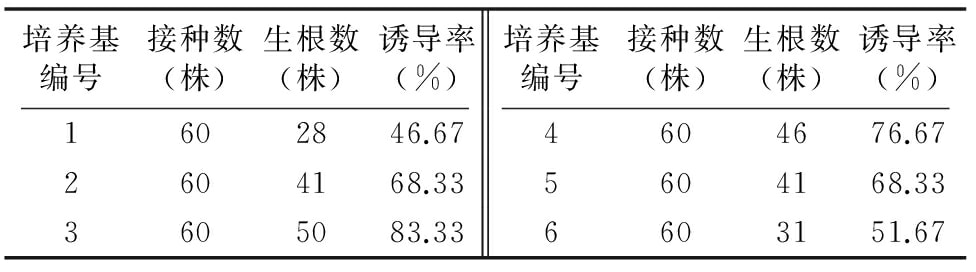 将生长健壮的丛生芽接种在含有不同浓度NAA的诱导培养基中,由表6可知,当NAA低浓度时生根诱导率随着NAA浓度的升高而增加,NAA浓度为1.2 mg/L时,诱导率高,达到83.33%。然而,随着NAA浓度的持续升高,生根诱导率呈现下降的趋势。因而确定佳生根培养基为MS+1.2 mg/L NAA。