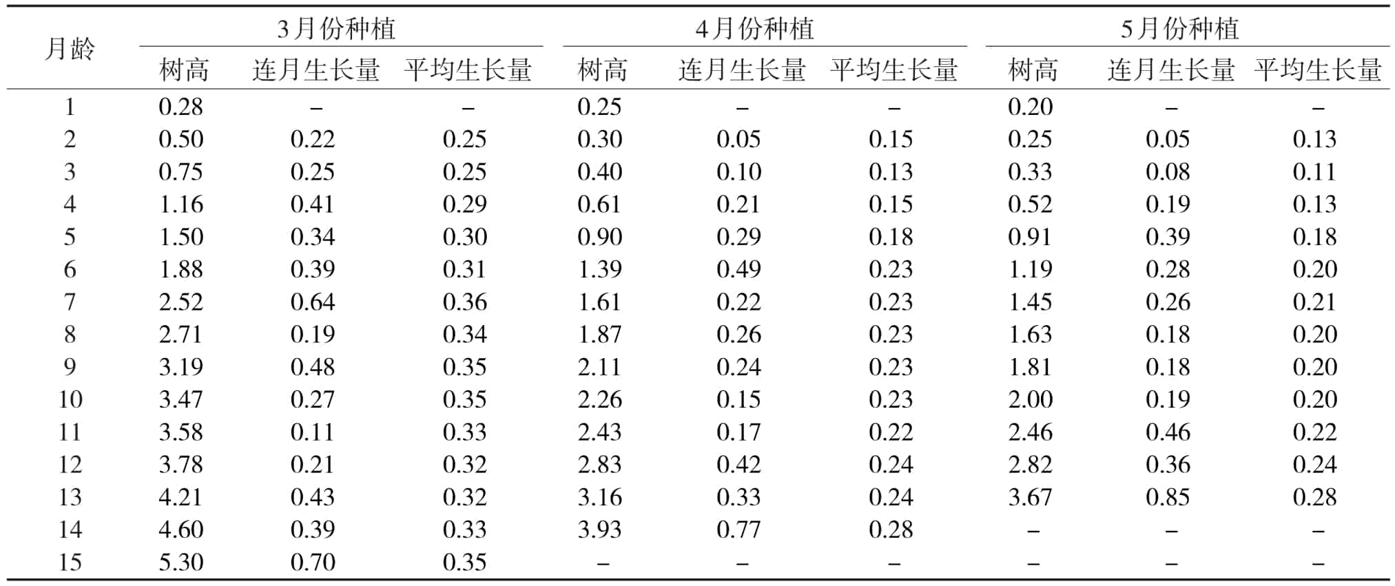 由表3可知:在相同的生长周期即同为12个月龄时,3、4、5月份种植的大花序桉粉色APP导航官网入口苗幼林林分平均树高分别为3.78、2.83、2.82 m,且在这个周期内的树高月平均生长量分别为0.32、0.24、0.24 m。3月份种植的林分树高生长量大于4、5月份种植的林分,且随着林龄增长,林分树高生长优势一直保持。3、4、5月份种植的大花序桉粉色APP导航官网入口苗林分树高连月生长量趋势基本一致,造林当年8月施肥后,在9月时树高连月生长量均达大,分别为0.64、0.49、0.39 m。3月份种植的大花序桉粉色APP导航官网入口苗林分在造林当年10月遭受台风影响后树高连月生长曲线出现较大波动,而4月份和5月份种植的大花序桉粉色APP导航官网入口苗林分受台风影响不大。3、4、5月份种植的大花序桉粉色APP导航官网入口苗幼林在第2年4月施肥后,均表现出较强的高生长趋势。
