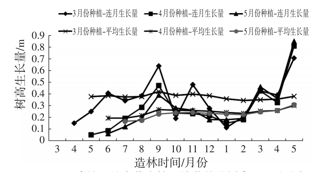图3 不同造林月份大花序桉粉色APP导航官网入口苗林分树高月平均生长量和连月生长量变化