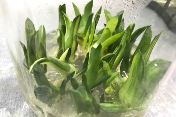 把培养物接种后,过一段时间就会形成原球茎,原球茎形成后就需要利用培养基和药物来诱导它生根,再生长出叶片形成有根和叶的小苗。