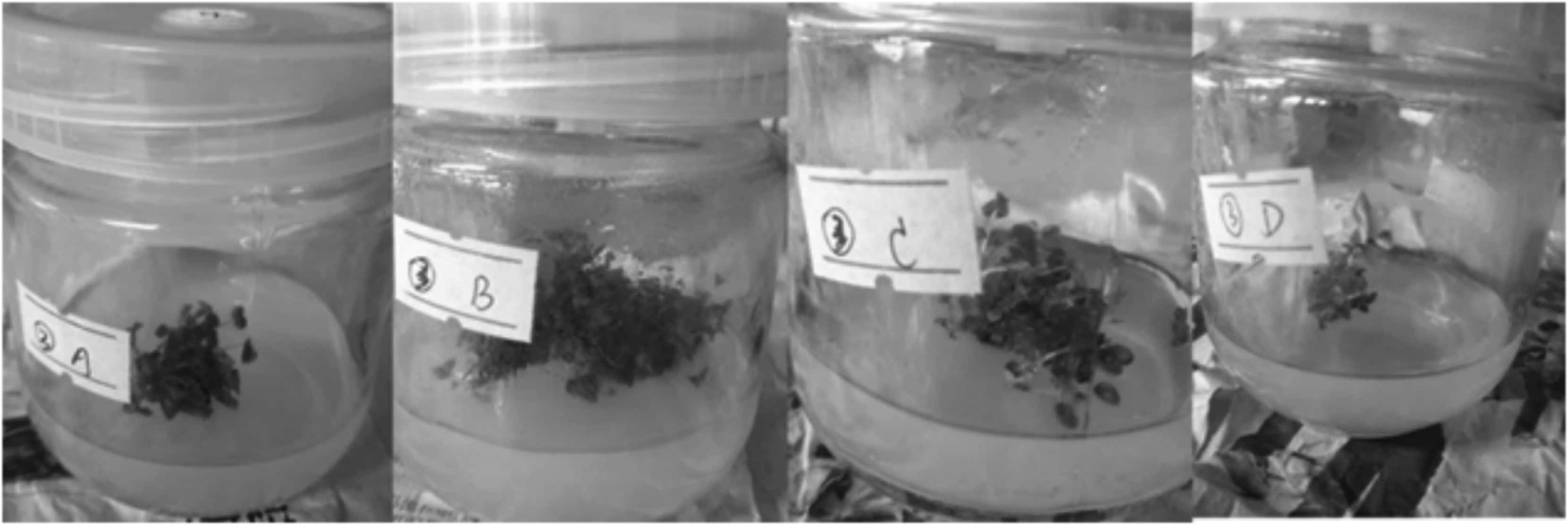 将丛生芽发出较好的的四个品种切分为带3-4片叶的芽簇,接入1/2 MS+IBA 1.5 mg·L-1+NAA 1 mg·L-1培养基内进行培养30 d后四个不同品种生根情况见图4。