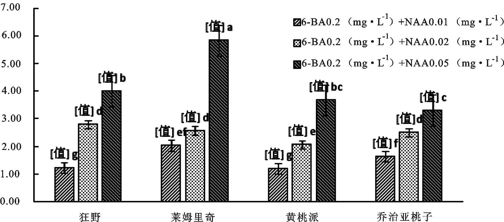 统计分析结果发现,品种与激素之间的互作差异显著,进一步分析两因素的互作效应,其中B品种莱姆里奇采用6-BA0.2 mg·L-1 +NAA 0.05 mg·L-1的诱导率最高,可达5.83,C品种“黄桃派”采用6-BA0.2 mg·L-1 +NAA0.01 mg·L-1的诱导效果最差,分析结果见图3。
