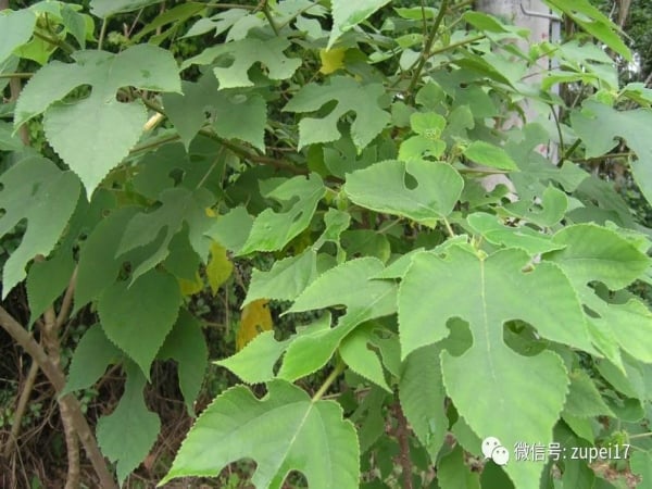 叶螺旋状排列,广卵形至长椭圆状卵形,长6-18cm,宽5-9cm,先端渐尖,基部心形,两侧常不相等,边缘具粗锯齿,不分裂或3-5裂,小树之叶常有明显分裂,表面粗糙,疏生糙毛,背面密被绒毛,基生叶脉三出,侧脉6-7对;叶柄长2.5-8cm,密被糙毛;托叶大,卵形,狭渐尖,长1.5-2cm,宽0.8-1cm。