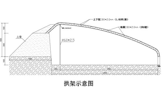 这种结构的大棚,各地区不尽相同,但其主要参数和棚形基本一致,大同小异。大棚的跨度6-12米、长度30—60米、肩高1一1.5米、 脊高1. 8—2.5米;按棚宽(跨度)方向每2米设一立柱,立柱粗6—8厘米,顶端形成拱形,地下埋深50厘米,垫砖或绑横木,夯实,将竹片(竿)固定在立柱顶端成拱形,两端加横木埋入地下并夯实;拱架间距1米,并用纵拉杆连接,形成整体;拱架上覆盖薄膜,拉紧后膜的端头埋在四周的土里拱架间用压膜线或8号铅丝、竹竿等压紧薄膜。