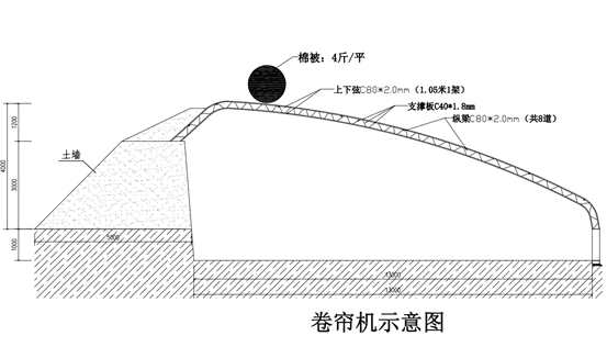 这种大棚跨度4一12米,肩高l一1.8米,脊高2.5—3.2 米,长度20—60米,拱架间距0.5—1米,纵向用纵拉杆(管)连接固定成整体。可用卷膜机卷膜通风、保温幕保温、 遮阳幕遮阳和降温。